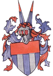 2 silbernen Balken, Helmzier mit blaurot-blau-rot-blauen Wulst und zwei nach außen gestellten Stangen geteilt Rot über Blau und Silber.